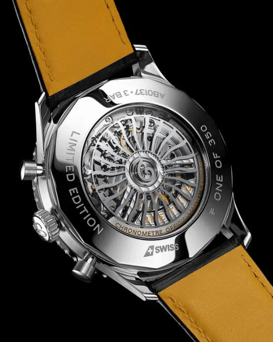 One of the most fascinating aspects of this movement is its transparent sapphire case back, allowing you to admire the craftsmanship of the caliber 01. An exclusive engraving, depicting the turbine of the Airbus A350 engine, is also present, reinforcing the aviation aspect of this limited edition. The best-selling reproduction watches is not only a technical achievement; it reflects unparalleled craftsmanship, the result of several decades of watchmaking expertise.