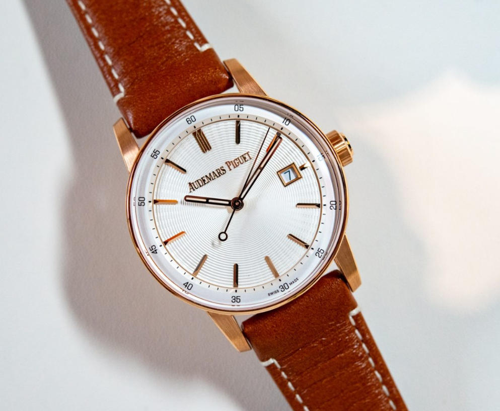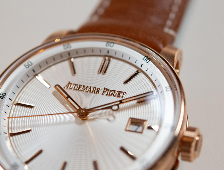 The 38 mm size debuted in 2023 powered by the calibre 5900, a movement supplied by Vaucher. It’s an industrial-haute horlogerie movement built to a similar standard as AP’s own in-house calibres, with a health 60-hour power reserve and a free-sprung balance suspended by a full balance bridge.